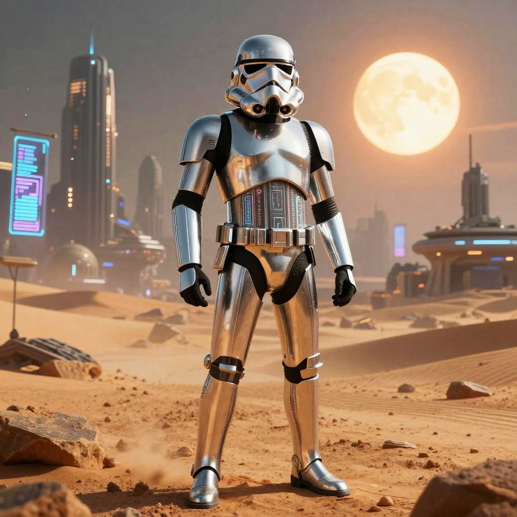 AI Star Wars inspired landscape, featuring a digital stormtrooper with sleek chrome armor infused with AI motifs, standing on a cyber-enhanced desert planet under twin suns, futuristic city skyline in the background, glowing holographic banners, cinematic sci-fi atmosphere.