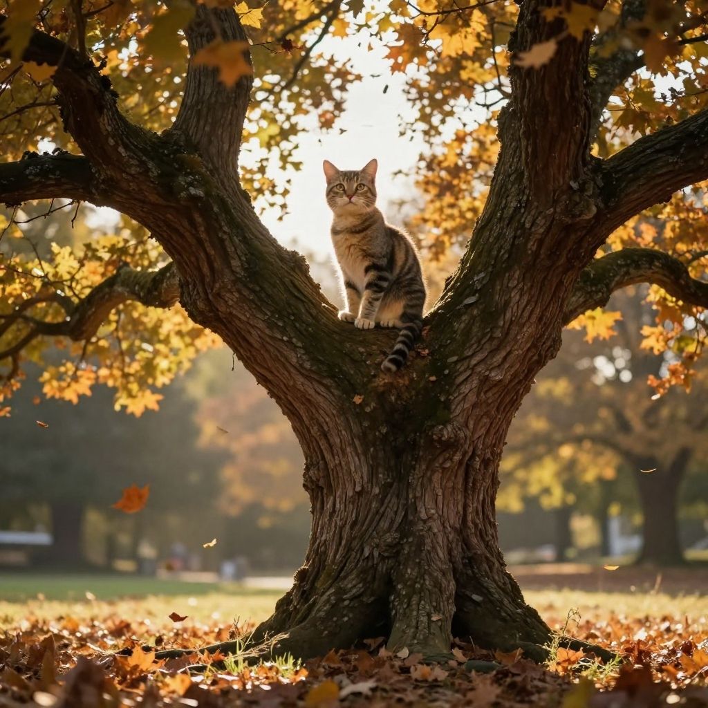 Disney, Pixar (Style: photo, Dramatic Lighting, trending on artstation, ((high quality:1.2, masterpiece:1.2)), (8k resolution), high details, incredibly absurdres, color connection, colorized, colorful), photo of a Cat poised gracefully atop an ancient oak tree, autumn leaves fluttering around, golden hour casting long shadows, backlit, sharp focus on feline, bokeh effect on background foliage, cinematic film still.
