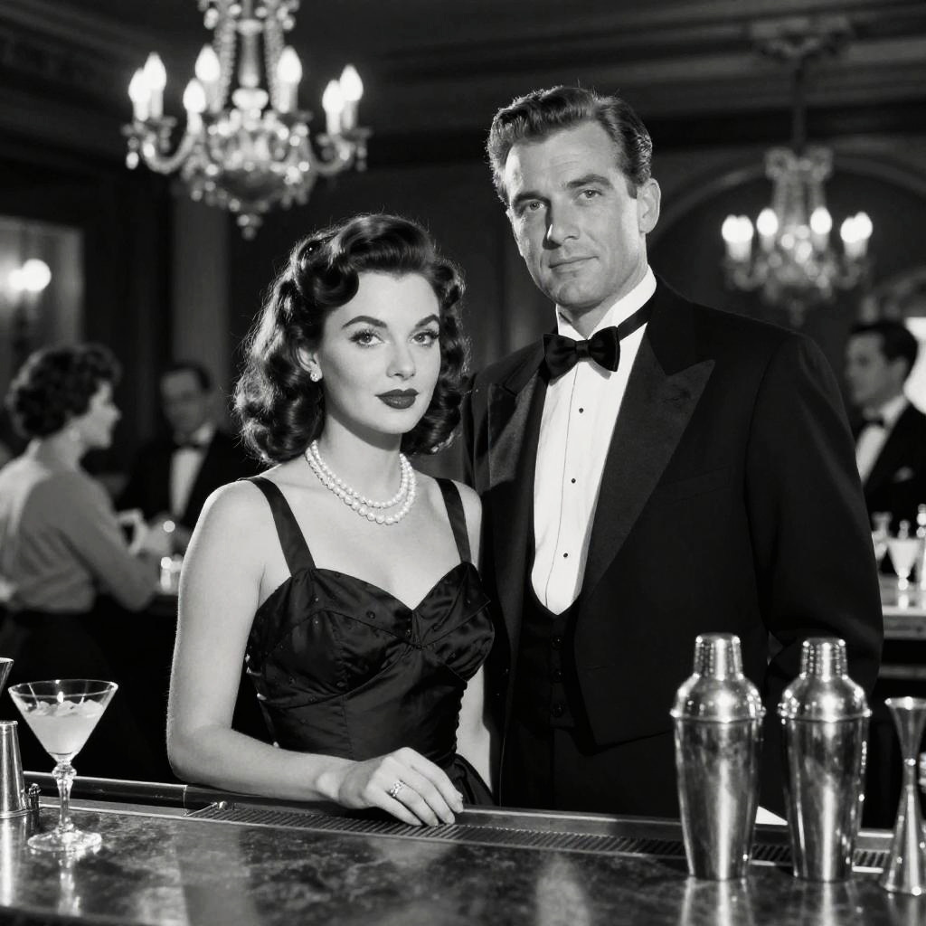 Black-and-white photograph of a 1950s-style couple in formal attire at a luxurious bar, with chandeliers, cocktails, and a sh