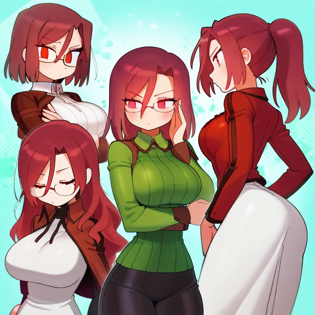 Digital illustration of an anime-style woman with red hair and glasses. She is shown twice, once with a ponytail wearing a white buttoned shirt, and once with shorter hair wearing a dark blue suit jacket. The character has red eyes and prominent features, depicted in a professional or office setting.