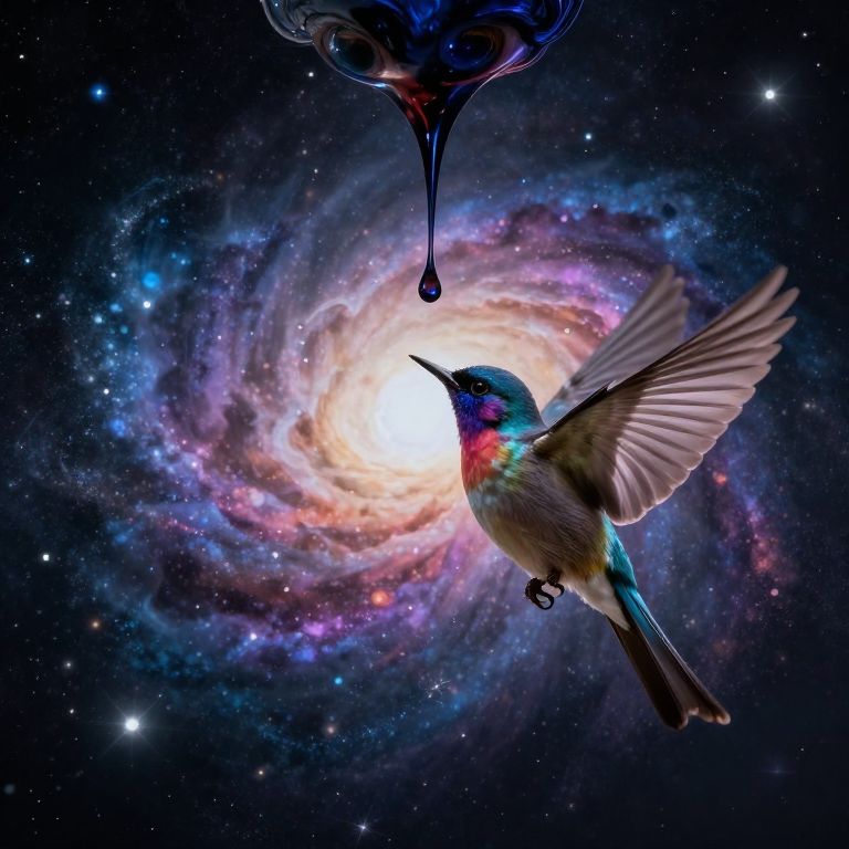 Photograph of a water droplet containing a galaxy, suspended mid-air, with ripples in water below, glowing in dark, blurry background.