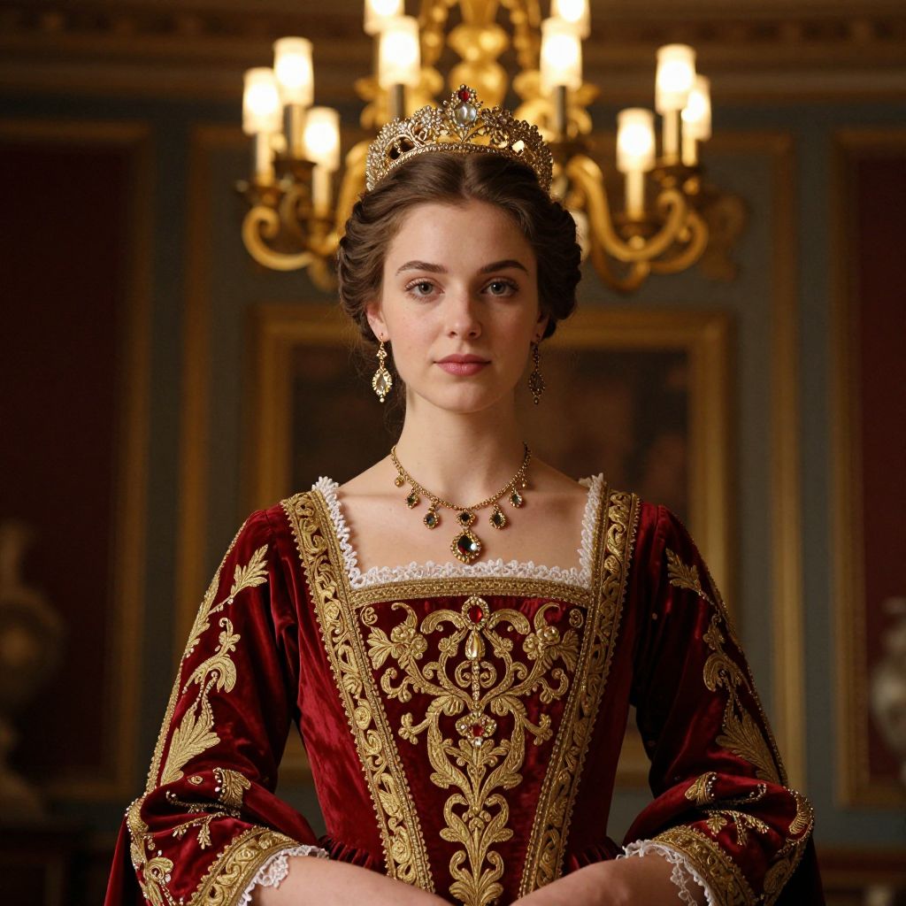 Photograph of a young woman with fair skin and brown hair styled in an elegant updo, wearing a gold crown and intricate gold earrings. She dons a rich, red velvet gown adorned with elaborate gold embroidery and white lace trim. A black gemstone pendant necklace rests on her chest. She stands in a grand, opulent room with dark blue and gold walls, and a large, ornate chandelier with lit candles hangs in the background. Her expression is calm and composed, exuding regal elegance. The overall scene evokes a royal, historical atmosphere.