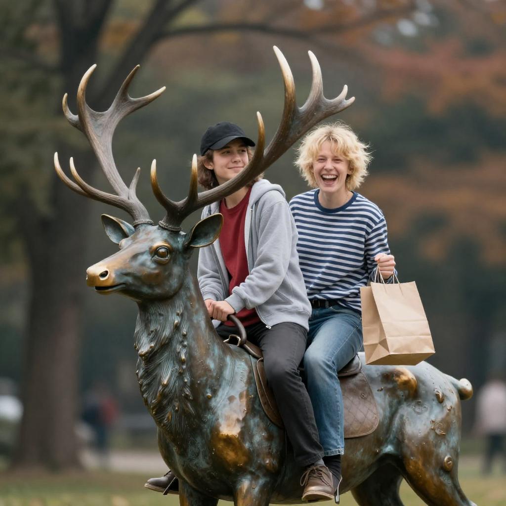 Photograph of two people riding a bronze deer statue with large antlers. The person on the left, wearing a black cap, gray hoodie, and red shirt, smiles. The person on the right, with messy blonde hair, a striped shirt, and blue jeans, laughs joyfully, holding a brown paper bag. Background features blurred autumn trees.