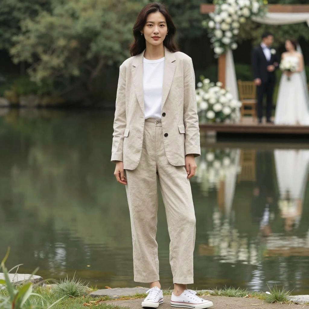 A woman in a relaxed beige linen blend pantsuit with a single-button blazer and white crew-neck T-shirt, minimal jewelry, and white low-top sneakers, styled in a Shogakukan visual aesthetic, standing by a serene lagoon with a wedding ceremony. Sexy. Pretty face and beutiful eyes
