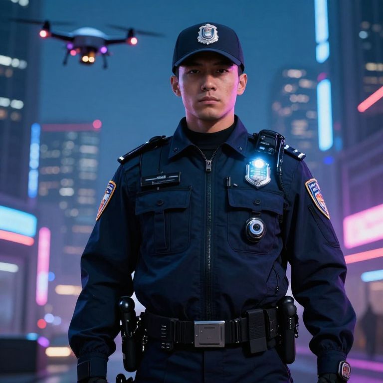 Police dress prompt: A futuristic reimagining of police dress, showing a smart uniform with integrated lights, sensors, and digital display on the jacket, worn by an officer in a high-tech city with neon lights and flying drones overhead.