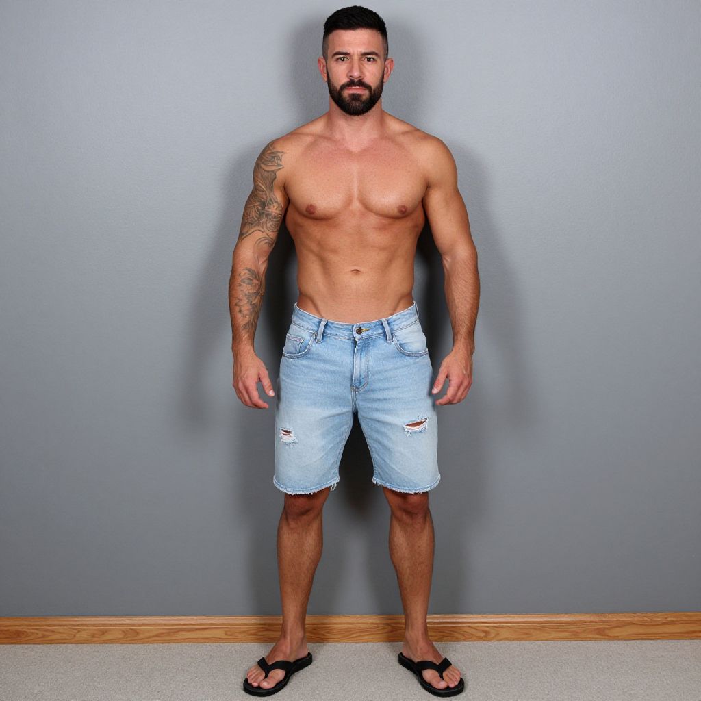 Photograph of a muscular, shirtless man with a trimmed beard and short black hair. He has a tattoo sleeve on his right arm and is wearing light blue, slightly distressed denim shorts with a small rip on the left thigh. He stands with his feet slightly apart, wearing black flip-flops. His skin tone is lightly tanned. The background is a plain, light gray wall with a wooden baseboard at the bottom. The floor is covered in light gray carpet. His expression is neutral, and he is standing against a shadow that falls to his left.