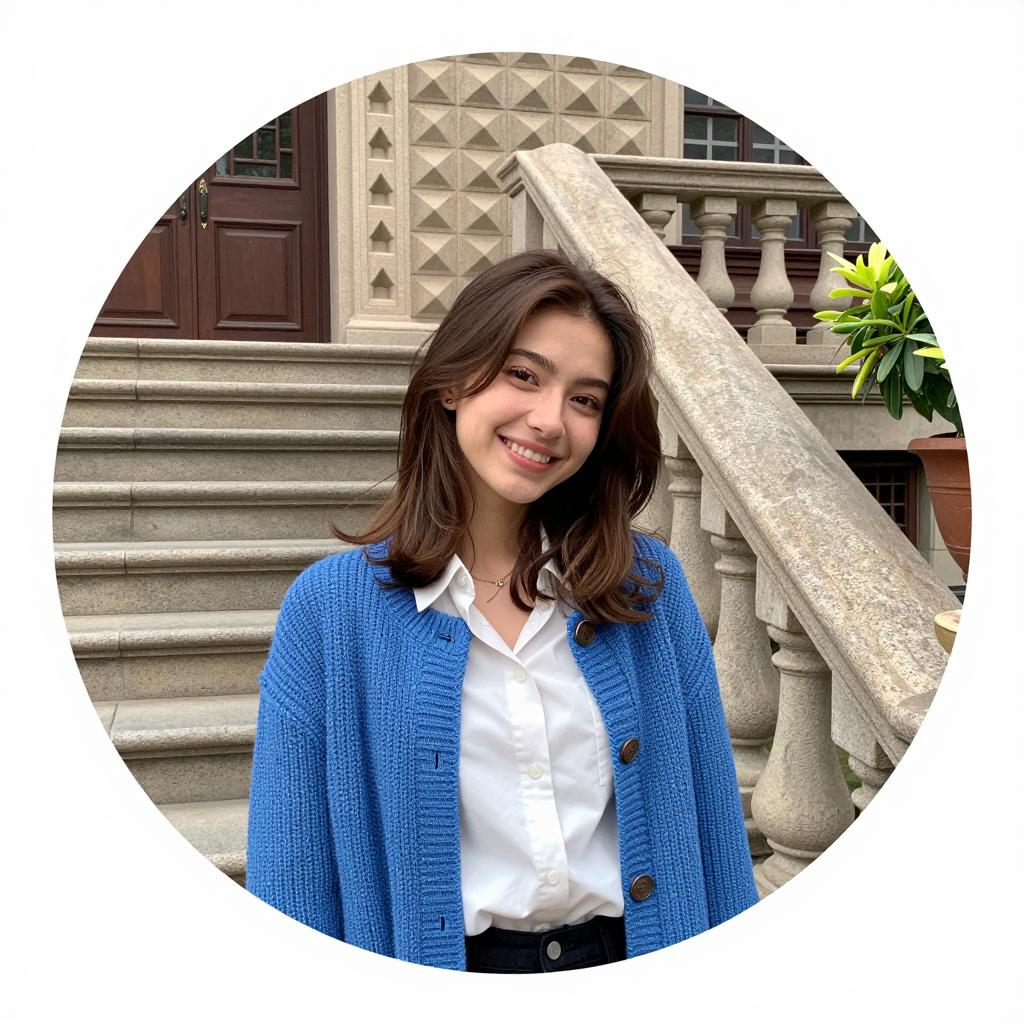 Young woman with medium-length brown hair, smiling, wearing a blue knitted cardigan over a white blouse, standing on stone staircase, ornate building with triangular patterns in background, circular overlay on image, right side with stone railing and potted plant.