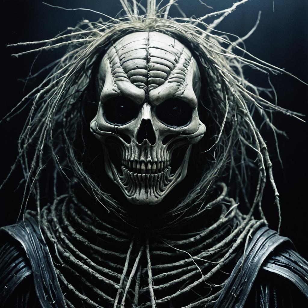 Close-up portrait of a surreal and horrifying humanoid scarecrow with a skull-like mask and intricate, textured details. The figure features dark, eerie twisted ropes or vines forming a skeletal structure around the neck and shoulders, with wild, thin dreadlocks or tendrils extending from the head. Cinematic lighting emphasizes the hyper-realistic, macabre textures of the mask and costume, inspired by dark fantasy and horror art.
