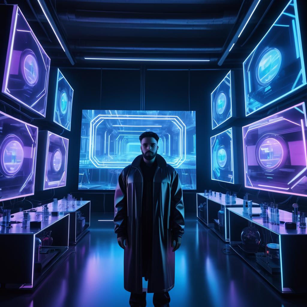 Wide-angle portrait of a man standing in a futuristic laboratory illuminated with neon blue and purple lights. The setting features multiple high-tech screens displaying abstract projections connected to the man's thoughts, and sleek workstations with scientific equipment. The man wears a long dark coat in a hyper-realistic, digitally rendered scene with a cyberpunk aesthetic.