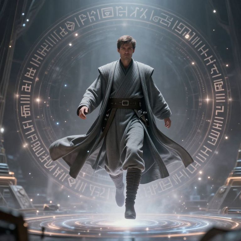 Grey Jedi tunic floating mid-air in a mystic energy field, surrounded by ancient rune symbols and soft glowing lights, futuristic fantasy style, a balance of light and shadow enhancing the tunic's detailed fabric layers and dynamic lines, ethereal atmosphere