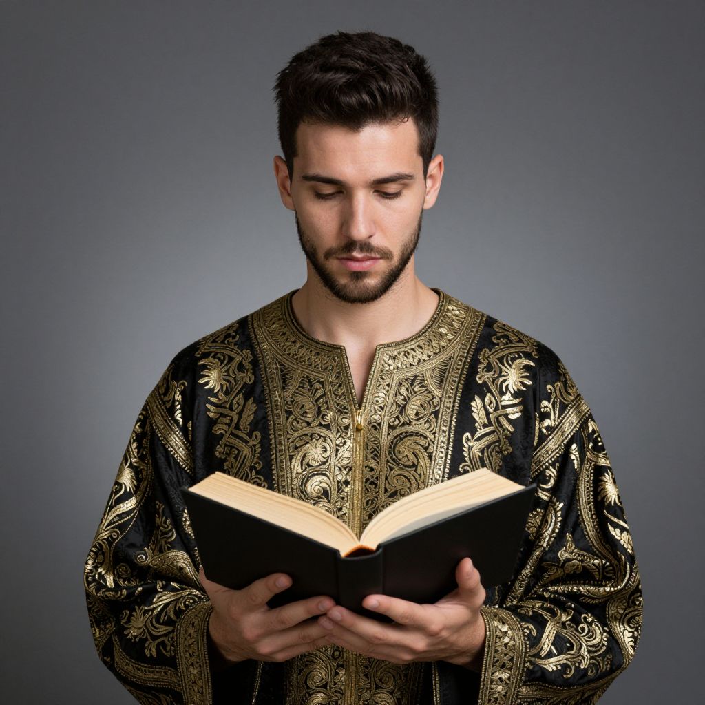 Photograph of a young man with short, dark hair and a trimmed beard, wearing an ornate black and gold robe with intricate patterns. He's holding an open book in front of him with both hands. The background is a plain, gradient gray. His expression is serious and focused. The lighting is even, highlighting the texture of his robe and the pages of the book.