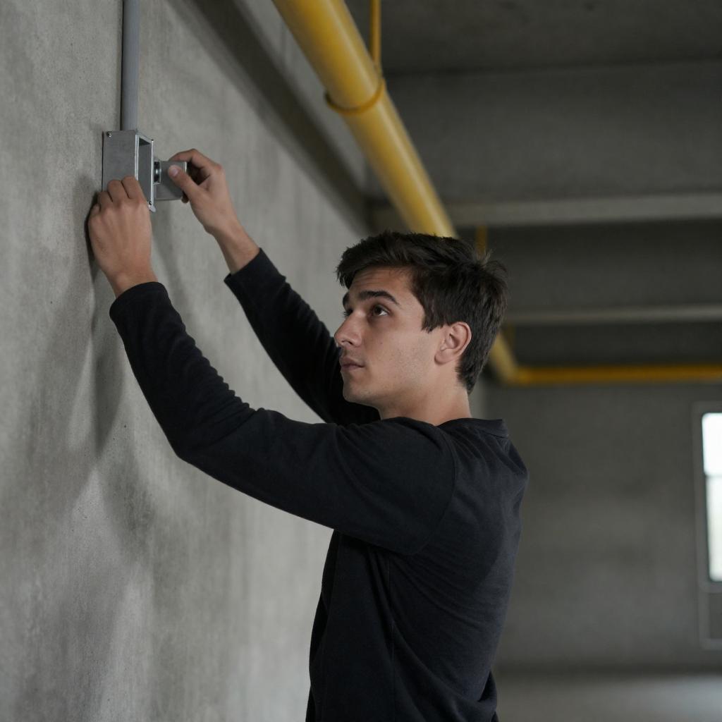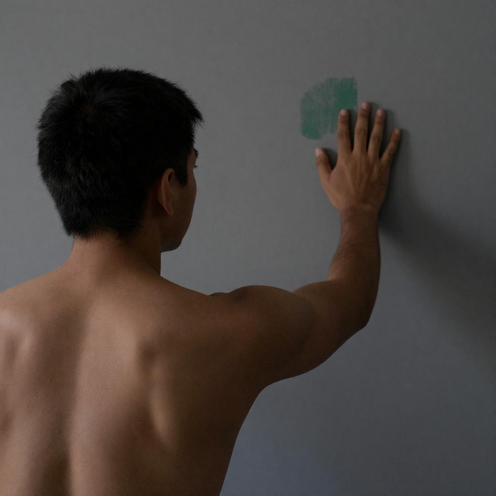 Man in white shirt, side profile, dark hair, focusing on old, cracked, ured wall with black object in his hand. Dimly lit, shadowy background. Silver faucet on left. Intense concentration.