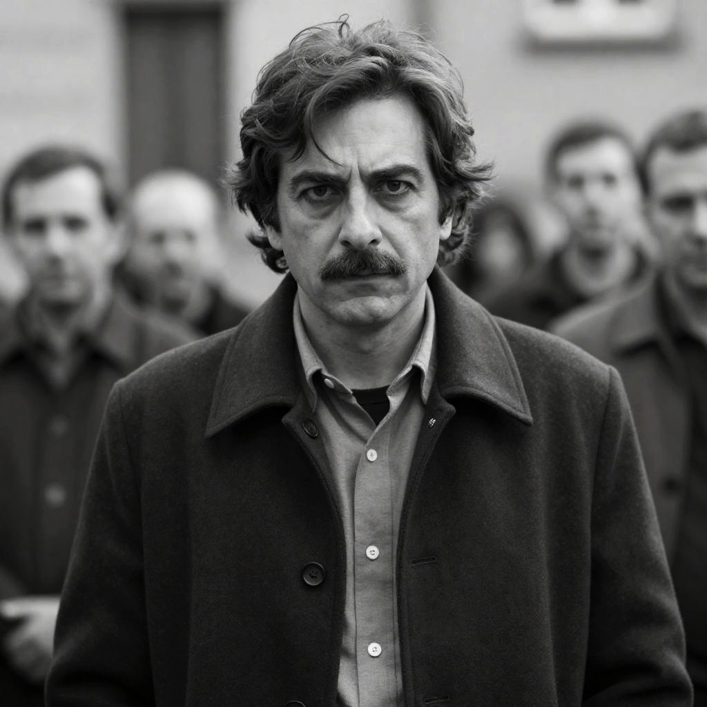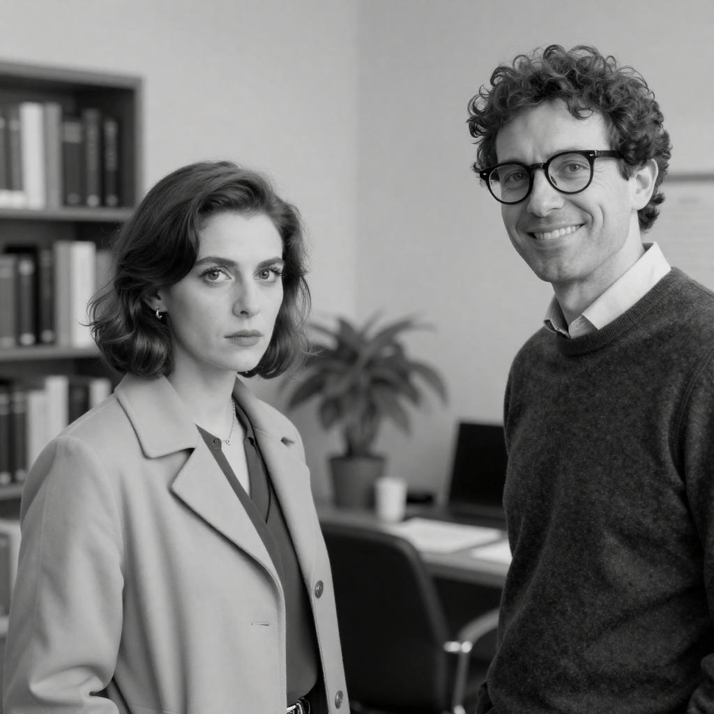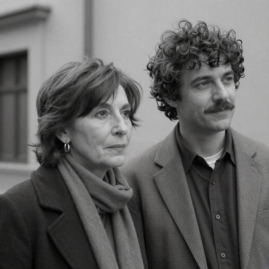 Black-and-white photograph of a middle-aged woman with short, wavy hair, wearing a scarf and hoop earrings, and a man with curly hair, mustache, and a checkered suit, standing close together. Woman's expression is neutral, man's expression is slightly smiling. Background is blurred. Both look to the right.