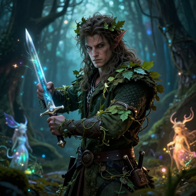 This digital fantasy artwork depicts a fierce, elf-like warrior with long, wild brown hair adorned with a leafy crown, standing in a mystical forest. He holds a glowing, blue-tinged sword with intricate designs, and wears a dark green, leafy armor with leather straps and metal accents. The background is dimly lit with ethereal blue and purple lights, and blurred trees, creating an enchanted atmosphere. A glowing, deer-like creature and a small, luminescent orb are visible in the background. The scene is rich in textures, from the warrior's rugged armor to the forest's dense foliage.
