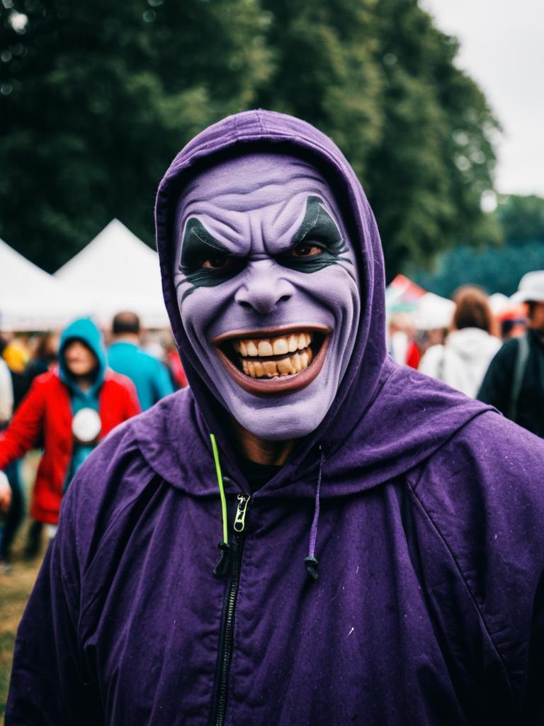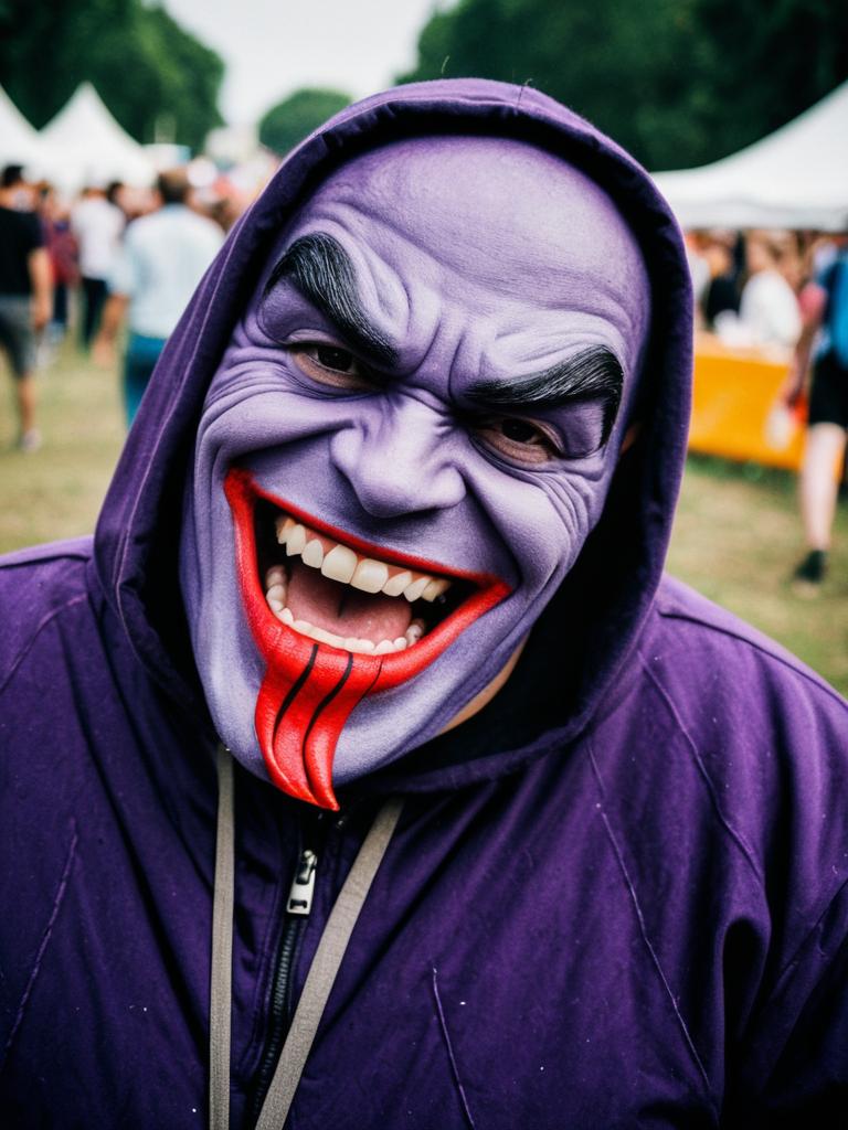 Man in Grimace Costume, festival cosplay photo, photorealistic realism