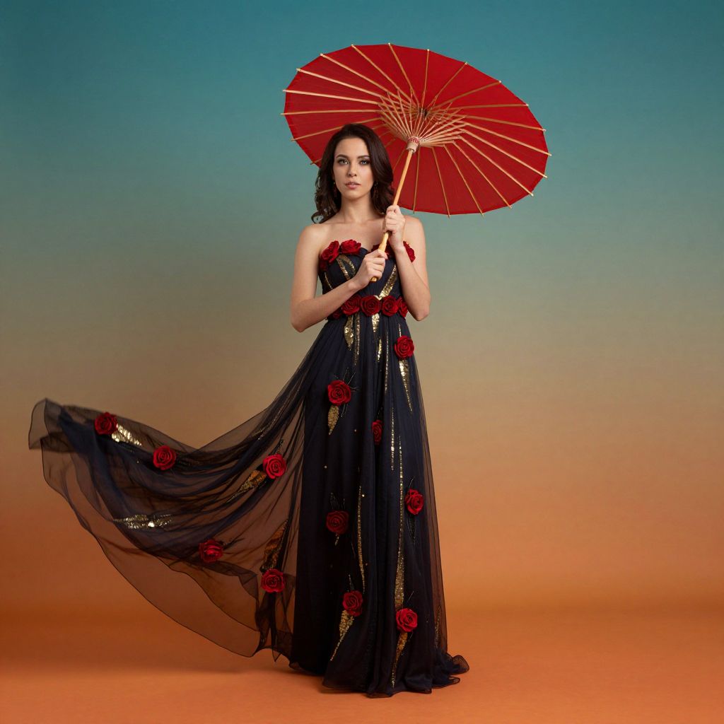 Woman holding a vibrant red parasol stands gracefully against a gradient backdrop of teal and orange hues, her flowing dark dress adorned with scattered red roses and golden accents trailing elegantly to the side.