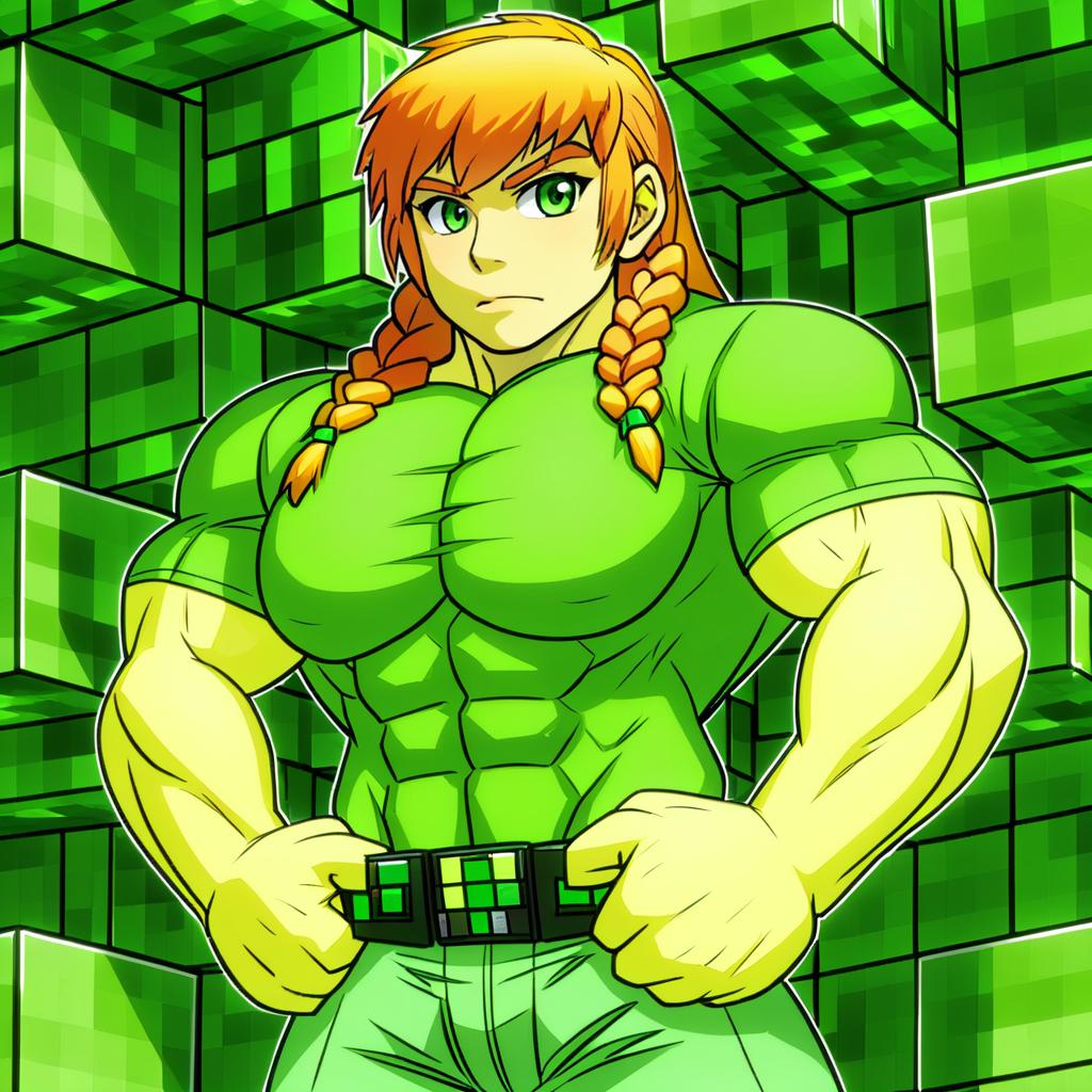 Alex (minecraft), minecraft, 1girl, green eyes, long hair, orange hair, braid, large breasts, green shirt, abs, muscular female, by artist hisahiko, anime