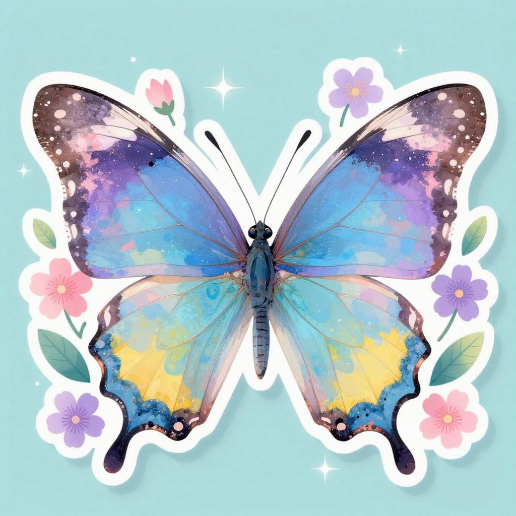 Digital illustration of two vibrant butterflies with detailed wings, one predominantly blue with rainbow hues and the other a shade of teal, against a white background with stylized green leaves and foliage. The design features soft gradients and smooth lines for a modern, nature-inspired look.
