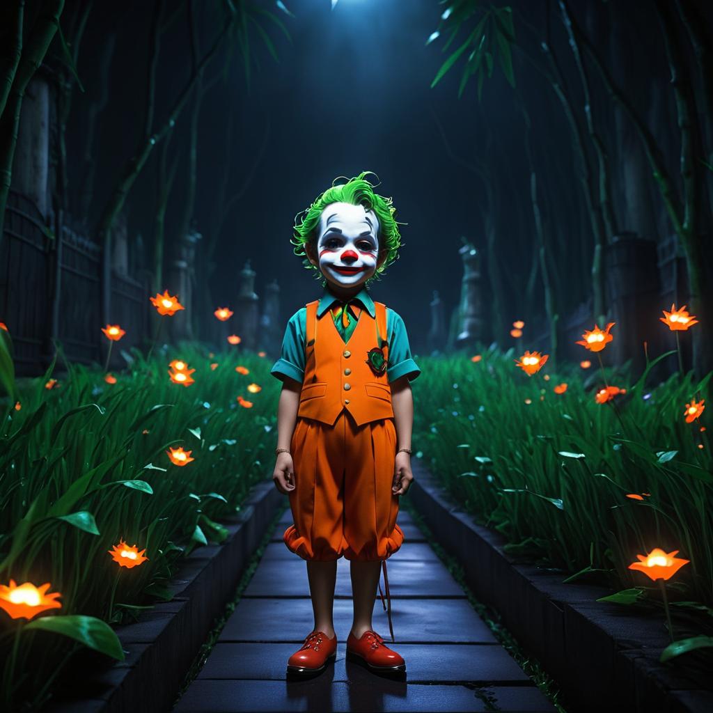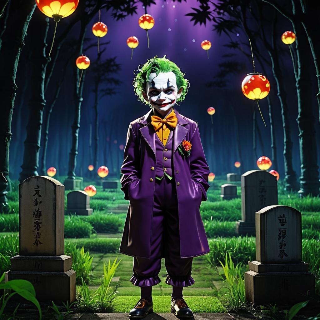 A vivid and high-quality depiction of the Joker character styled in the attire reminiscent of the movie 'Grave of the Fireflies'. The character has green hair, distinctive white face makeup with red and black clown markings, and is dressed in a purple suit with an orange vest and bow tie. The scene is set in a nighttime forest cemetery with glowing red and yellow lanterns floating above gravestones under a starry purple sky.