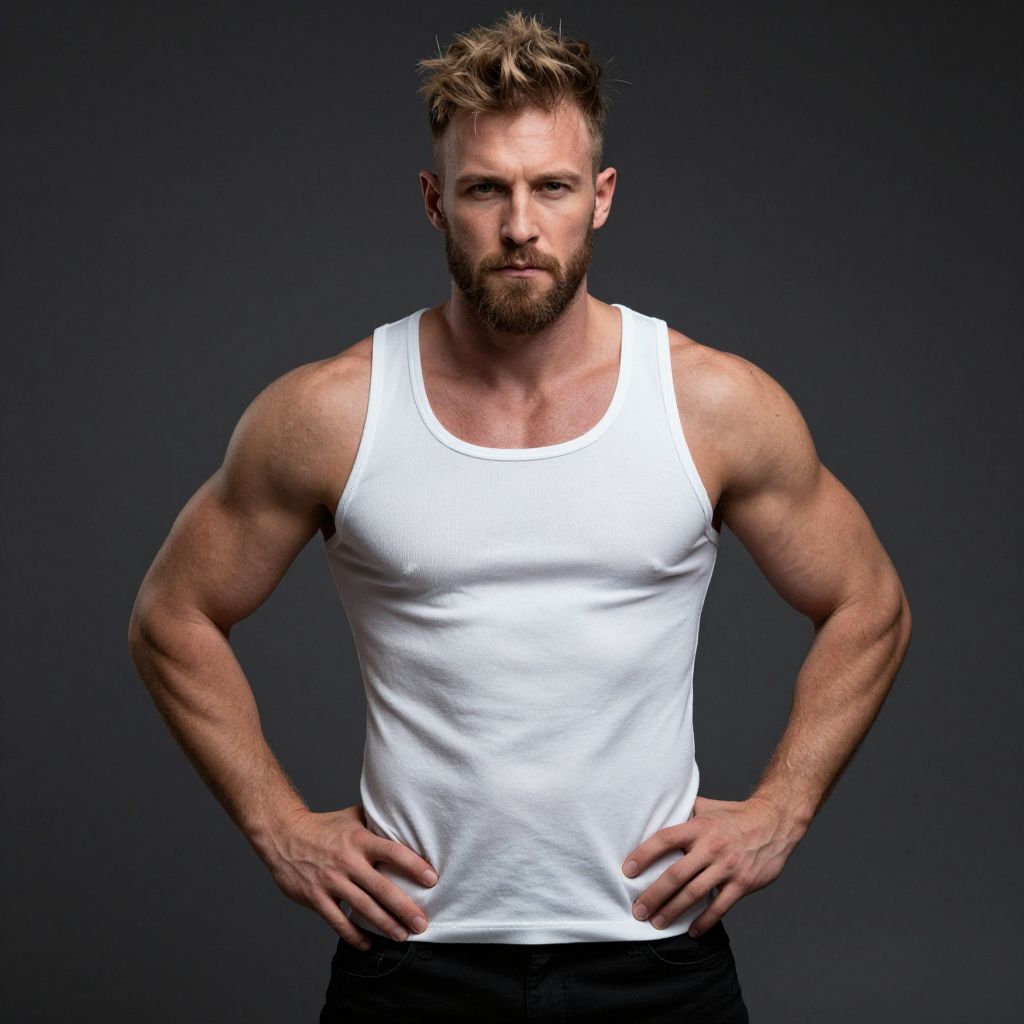 Photograph of a muscular, bearded man with short, messy blonde hair standing against a dark gray background. He's wearing a white, form-fitting tank top that highlights his well-defined biceps and chest, and black pants. He's looking directly at the camera with a serious expression, hands on his hips. The lighting is even, emphasizing his toned physique.