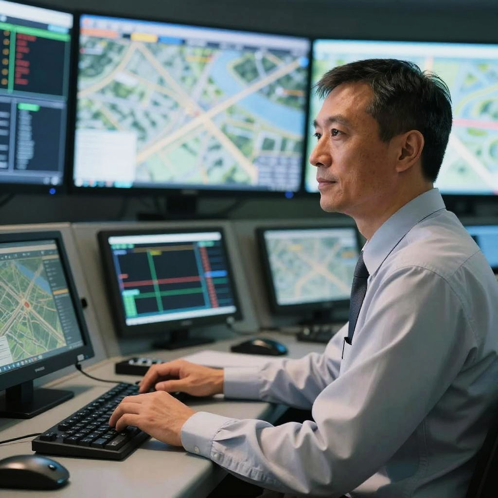 Photograph of a middle-aged Asian man with short, dark hair, wearing a white dress shirt and black tie, seated at a cluttered control desk. He is focused on multiple computer monitors displaying detailed maps and colorful data graphs. The man is typing on a black keyboard with his right hand. The background consists of several large, brightly lit screens showing maps and data, creating a high-tech, professional atmosphere. The lighting is bright, highlighting his focused expression and the sleek, modern equipment surrounding him.