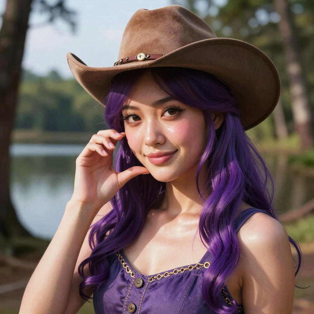 Photograph of an Asian woman with long, wavy purple hair, wearing a brown cowboy hat and a sleeveless, purple top with gold buttons and lace trim. She has fair skin, pink blush, and a subtle smile. Her right hand is gently touching her hat. The background shows a blurred, sunny outdoor scene with a lake and trees. The image has a slightly enhanced, digital filter effect, giving it a semi-realistic, slightly stylized look. The lighting highlights her face and hair, creating a warm, inviting atmosphere.