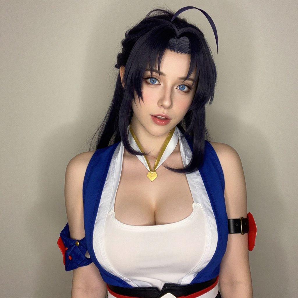 Sexy cosplay woman character wearing Shinobu Wakamiya costume. Realistic photo. Jane Doe dressed as Shinobu Wakamiya. Realistic photo, caucasian woman, pretty cute face, very big breasts