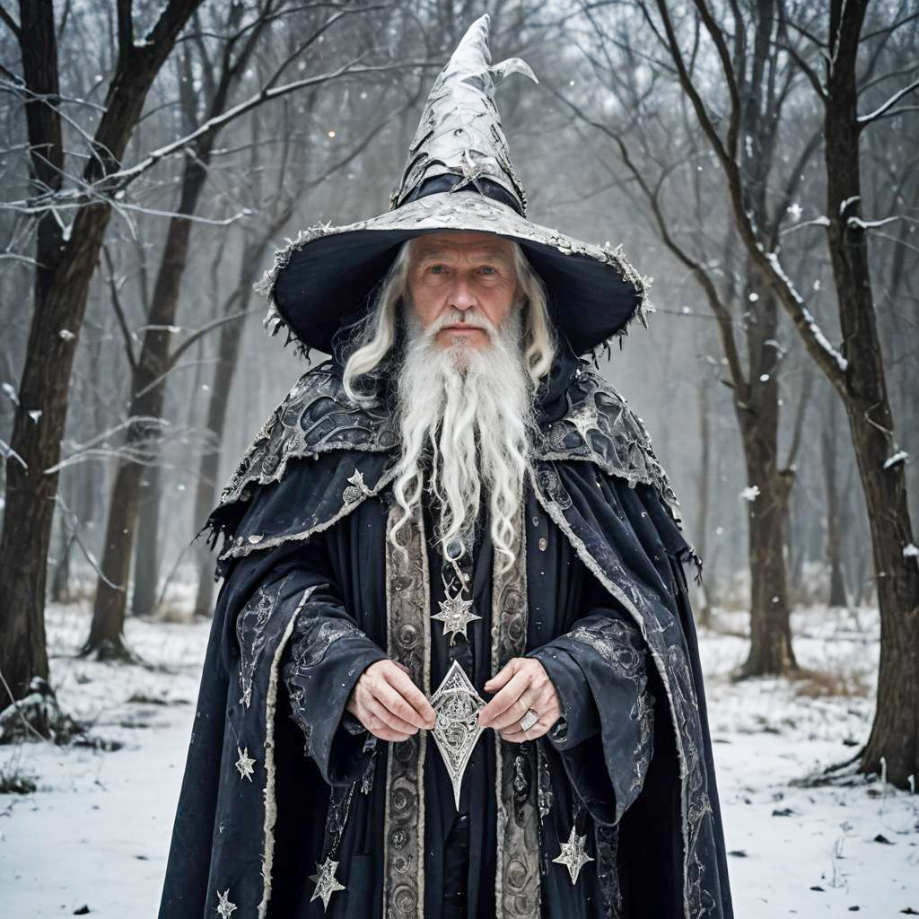 Elderly man, Snowy White Beard, halloween outfit, tattered cloak, silver wizard hat with stars, fantastical realm