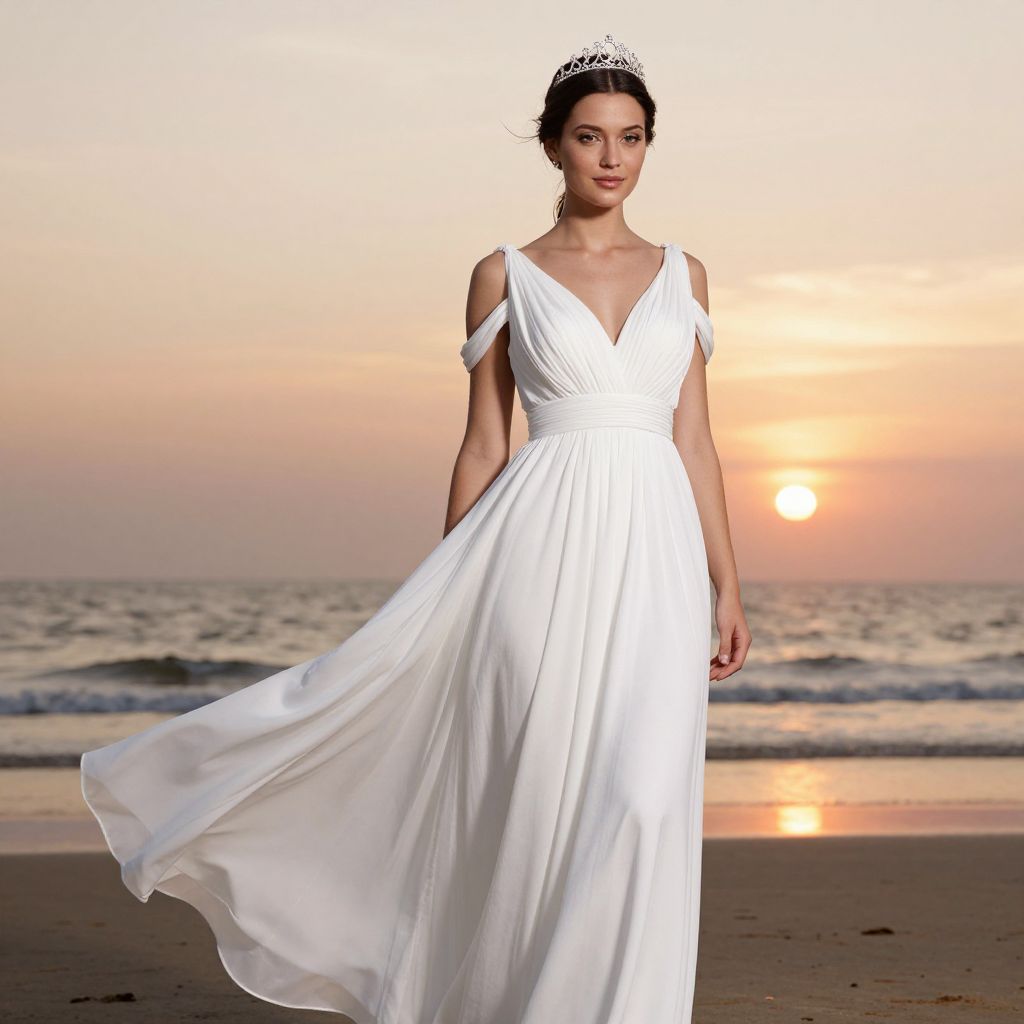 Flowy white dress, with slouched shoulder straps, worn by young woman, with dark hair tied back, and silver tiara, beach wedding at sunset