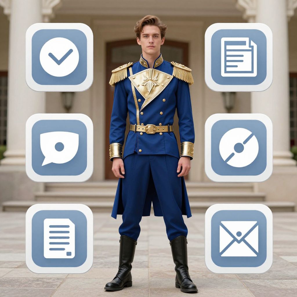 Icons Costume, man in blue and gold outfit standing in front of a building