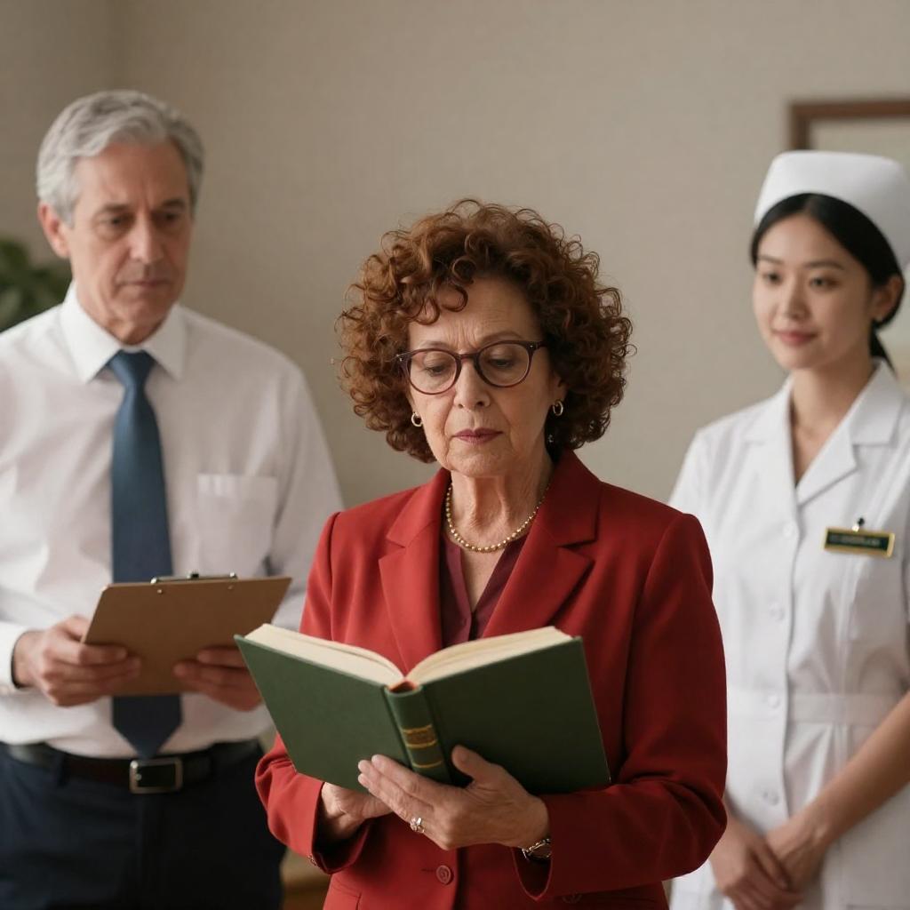 Photograph of two women in a medical setting. Blonde woman with glasses and white shirt, serious expression, foreground. Dark-skinned woman in white lab coat, clipboard, background. Anatomical chart on wall. Blue lighting. Nurse's cap on dark-skinned woman.