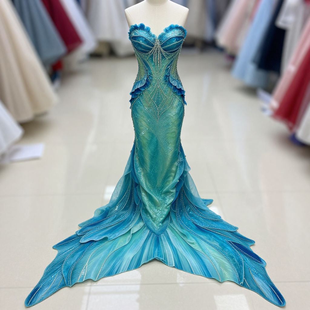 The image showcases a stunning mermaid tail gown, featuring a gradient of vibrant blues and greens that mimic the colors of the ocean. The dress is meticulously crafted with intricate details, including a bodice adorned with shimmering beads and sequins that add a touch of elegance. The gown's tail, resembling a mermaid's fin, is composed of layered, petal-like fabric that cascades elegantly from the waist, creating a dramatic and flowing effect. The dress is displayed on a mannequin, allowing for a full view of its stunning design. In the background, various fabrics and materials are scattered, suggesting the dress is in the process of being created or altered. The overall composition highlights the dress's elaborate design and the skill required to create such a masterpiece.