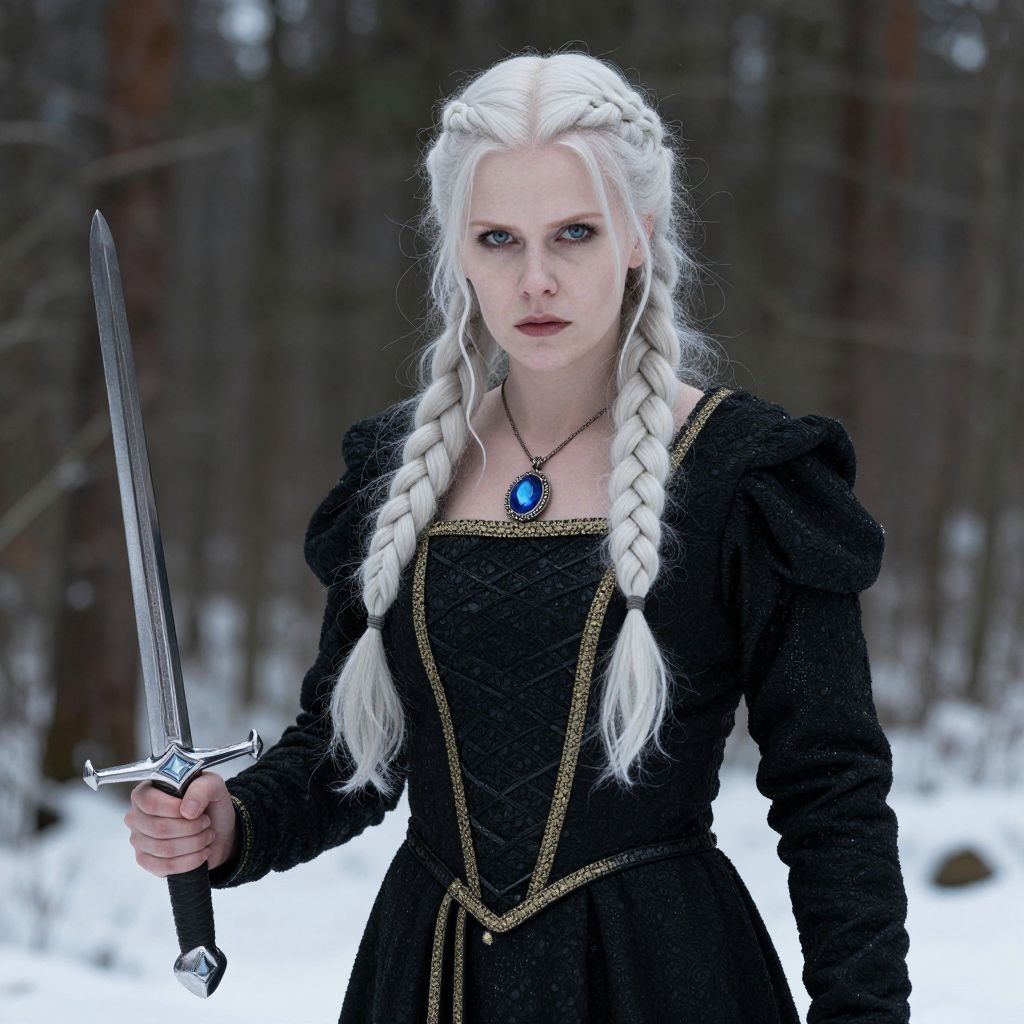 Photograph of a pale-skinned woman with long, white braided hair standing in a snowy forest. She's wearing a black, medieval-style dress with gold trim and a blue gemstone necklace. She holds a silver sword with a diamond-shaped hilt in her right hand. Her intense blue eyes and serious expression give her a fierce, warrior-like presence. The background is blurred with dark trees and snow.