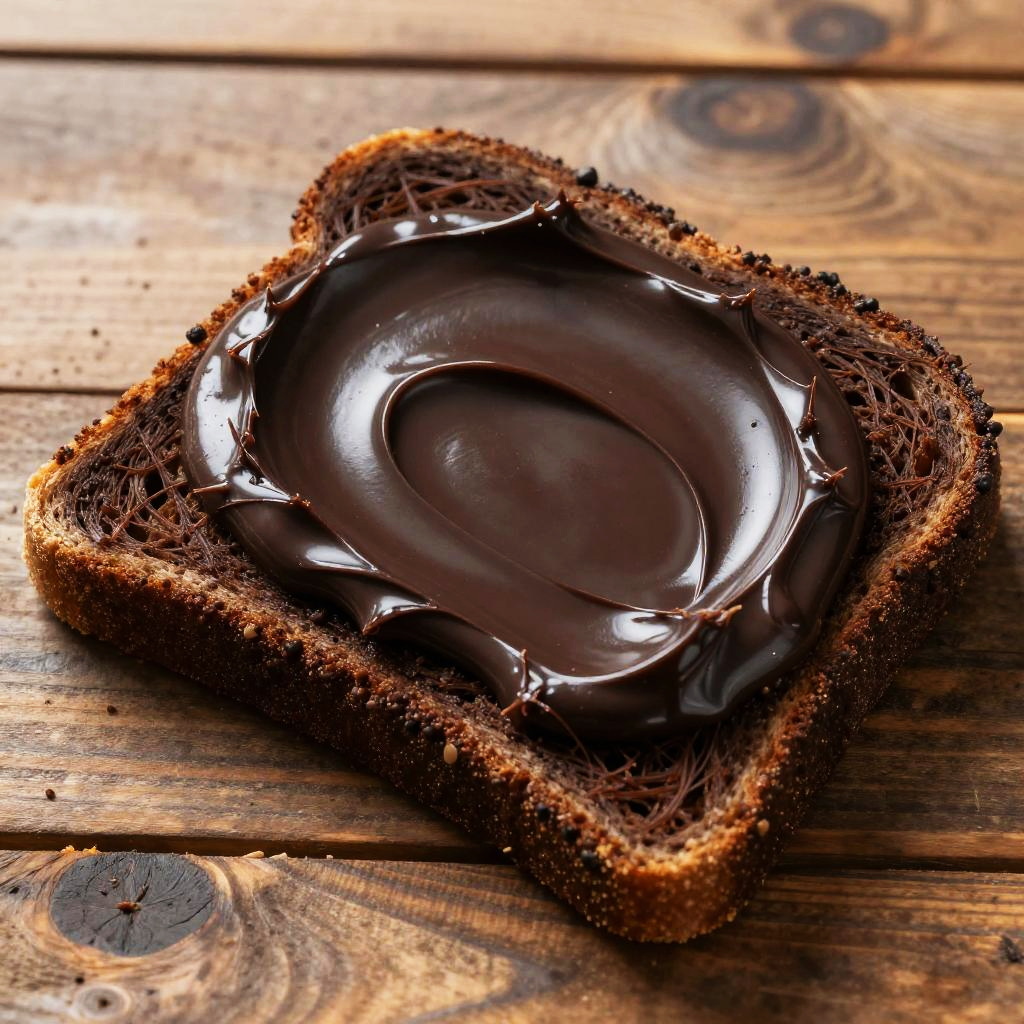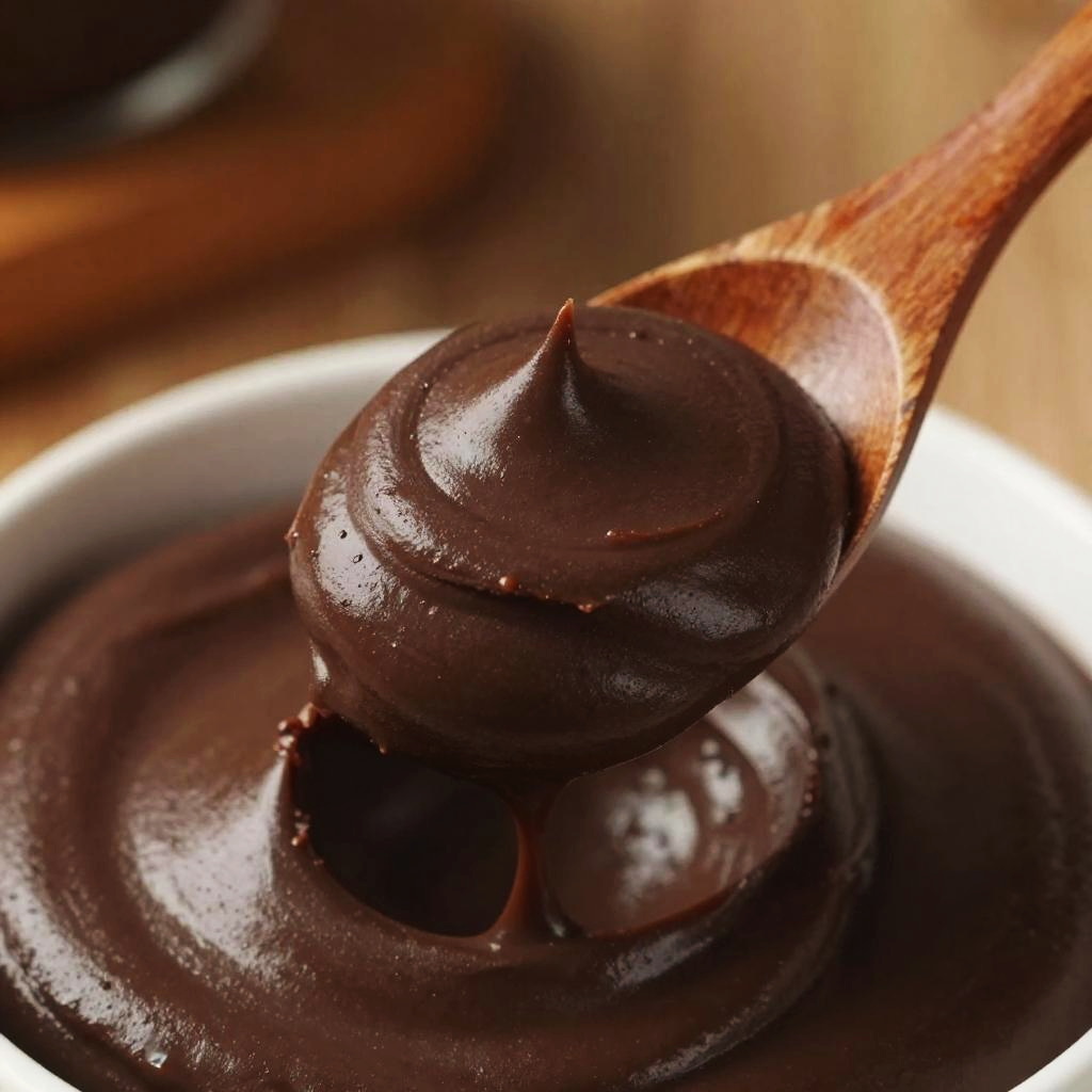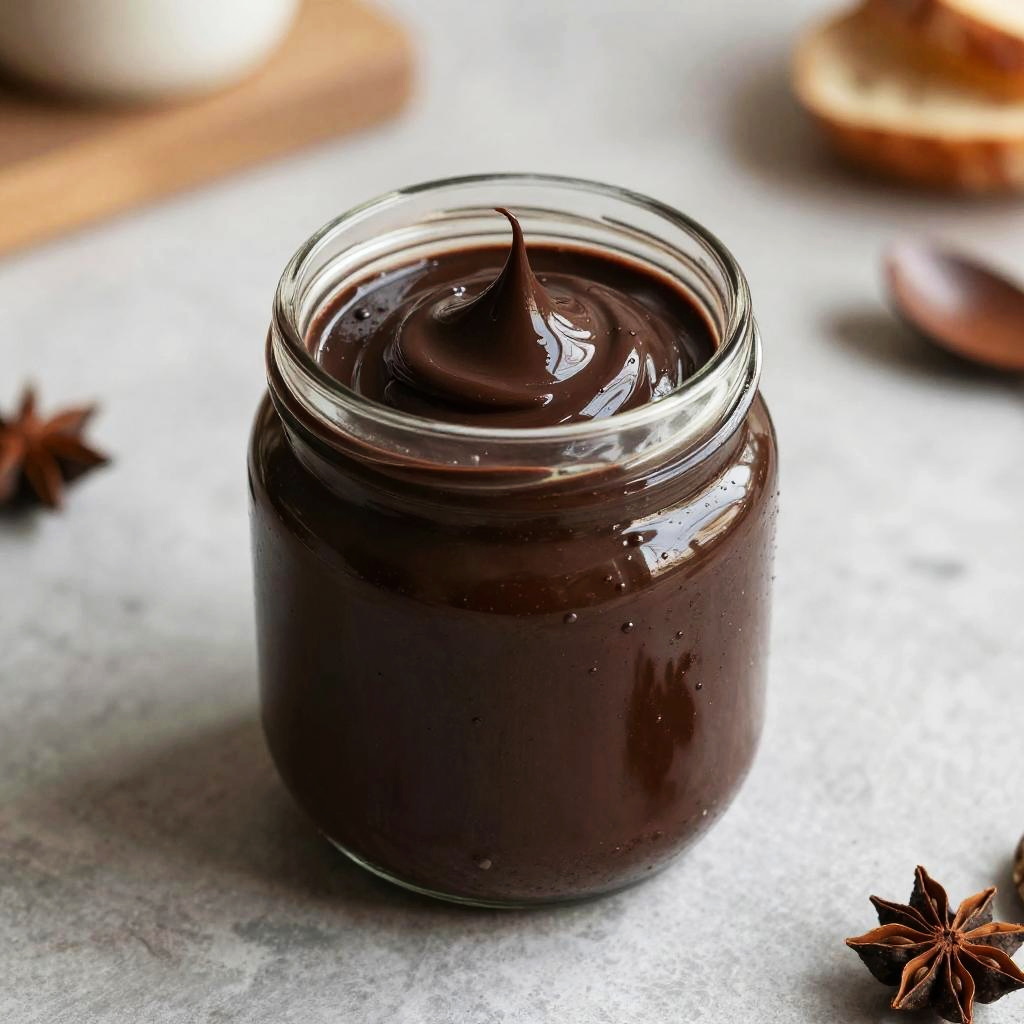 Thick ebony cream swirled elegantly in a glass jar, deep dark chocolate tones, creamy texture with glossy highlights, rustic kitchen background, natural soft sunlight