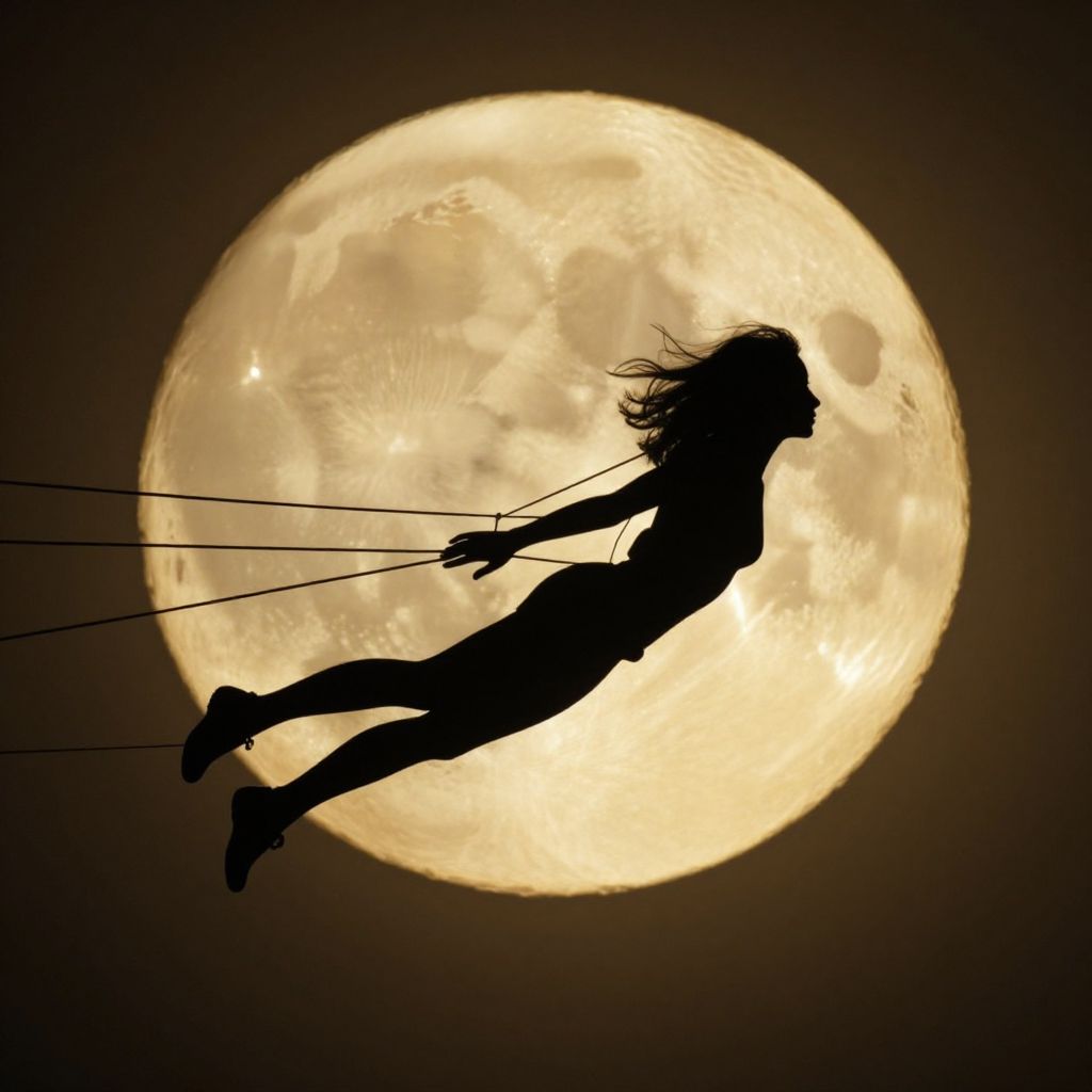 Against the radiant backdrop of a golden moon, a silhouette of a woman in flight, tethered by unseen threads, embodies the eternal struggle between freedom and constraint, her flowing hair whispering tales of longing and transcendence.