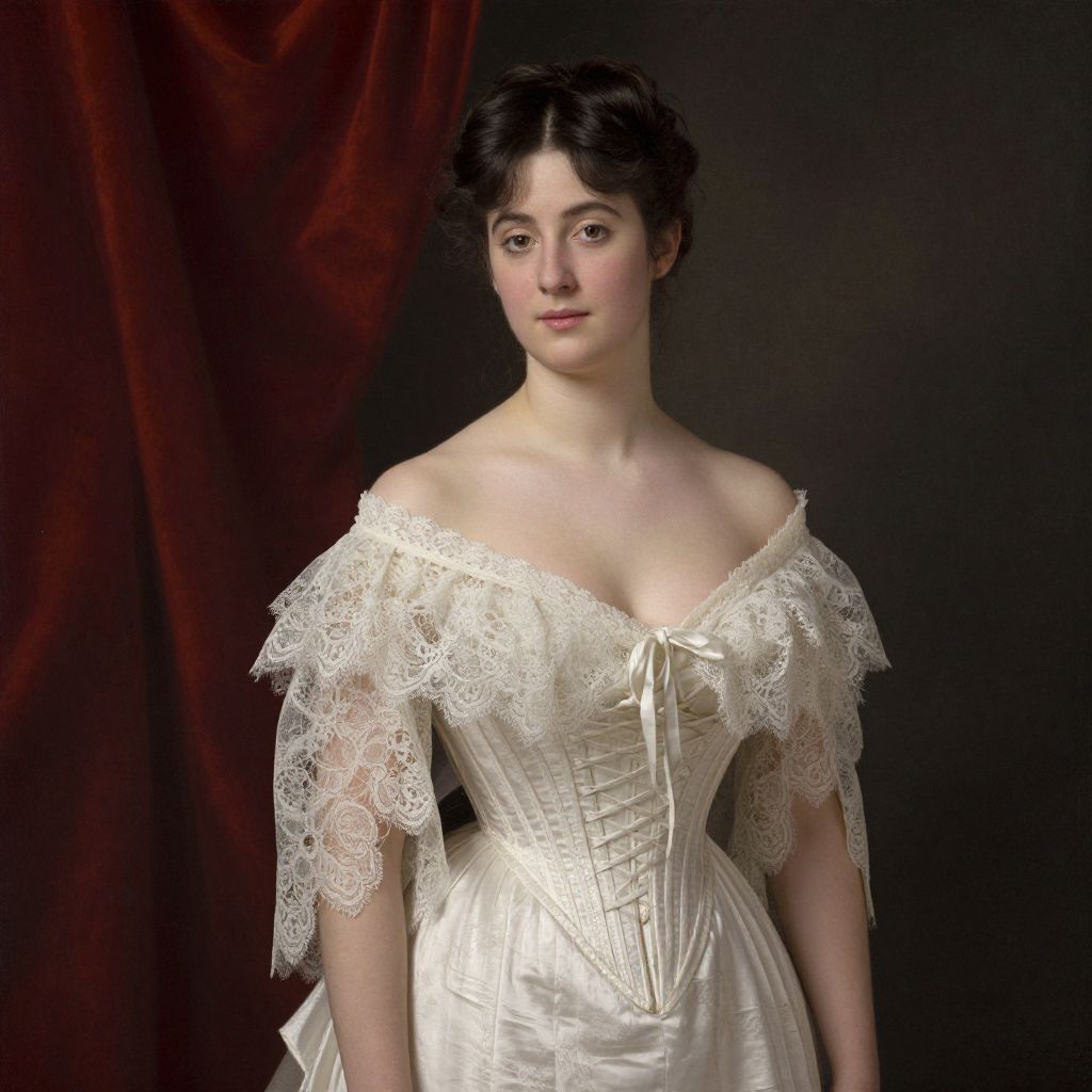 Elegant portrait of a woman in a Victorian-era gown, featuring off-the-shoulder lace detailing and a corseted bodice, set against a dark background with a rich red curtain to the left, evoking the style of Edward John Cobbett's mid-19th-century portraiture.