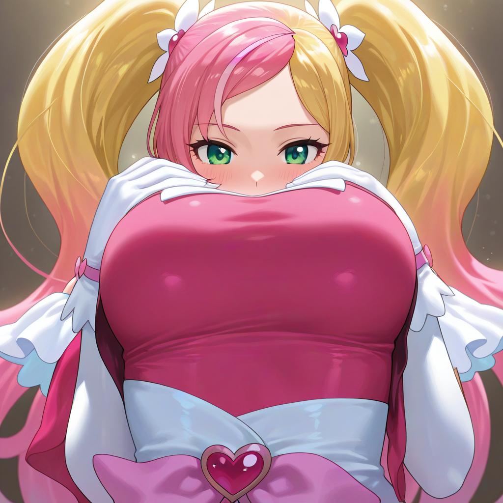 Haruno haruka, precure, 1girl, green eyes, blue eyes, blonde hair, pink hair, long hair, two-tone hair, streaked hair, gradient hair, white gloves, waist bow, pink bow, magical girl, magical girl, by artist nhaliz, illustrious