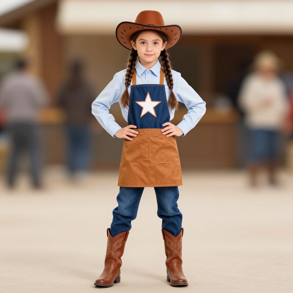 A photograph of a young girl standing confidently in a western-themed setting. She has long brown hair in braids, wearing a brown cowboy hat, light blue long-sleeve shirt, and a brown denim apron with a large white star patch. She also wears dark blue jeans and brown cowboy boots with intricate stitching. Her hands are on her hips, and she looks directly at the camera. The blurred background features indistinct figures and a wooden building, suggesting a town or fair setting. The image has a bright, slightly overexposed quality.