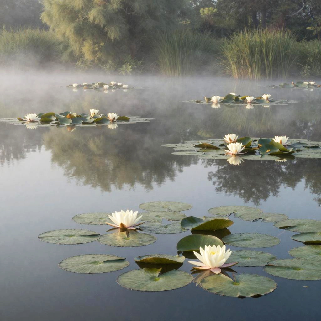 Water Lily Pond, serene water surface, bright sunshine, midday light, Abstract painting