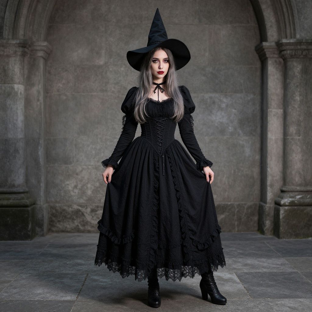 "Witch Gothic Dress, woman in a black dress and hat posing for a photo"