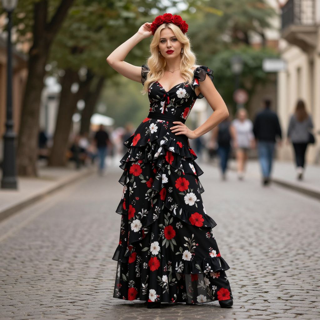 Photograph of a blonde woman standing on a cobblestone street, wearing a black floral dress with red and white flowers, layered ruffles, and a red rose headpiece. She's holding the headpiece with one hand, striking a confident pose. The background shows a blurred, tree-lined street with people walking and buildings. The overall style is vibrant and slightly dramatic.
