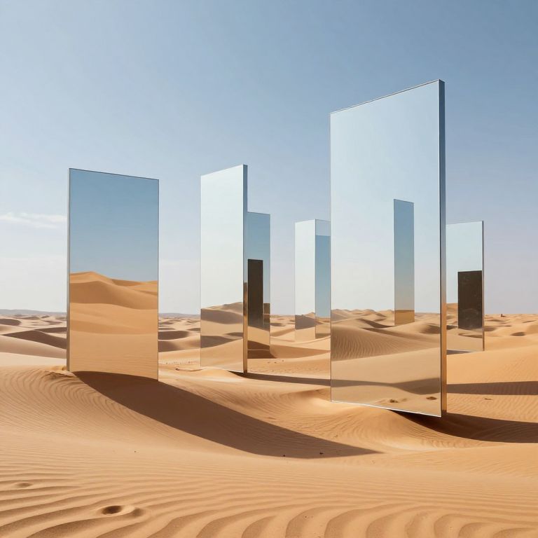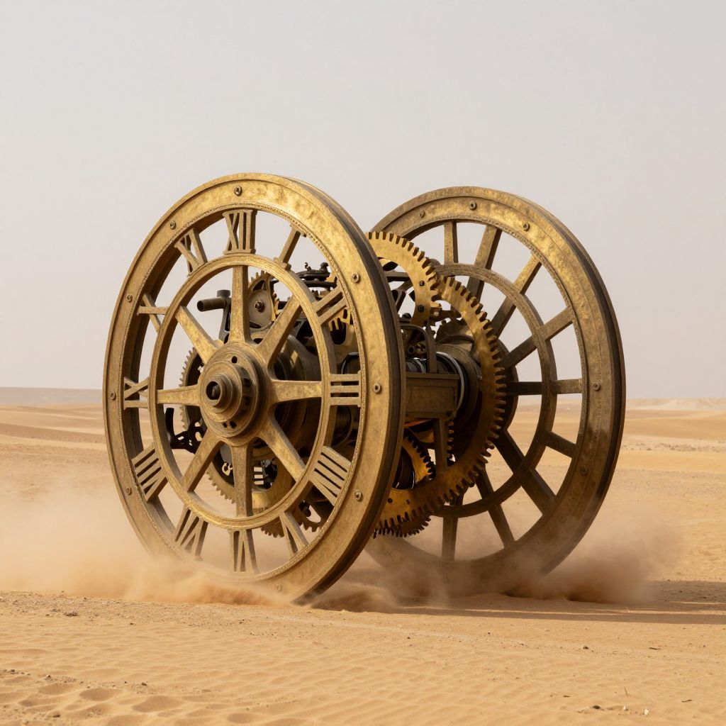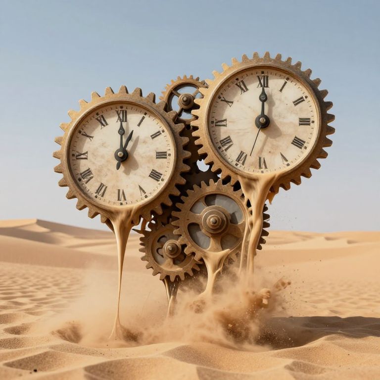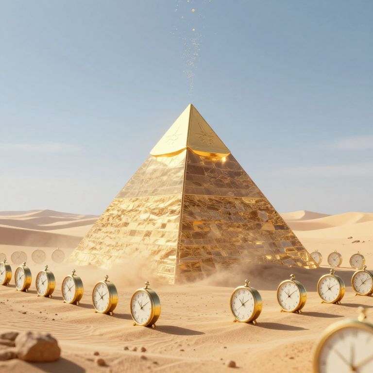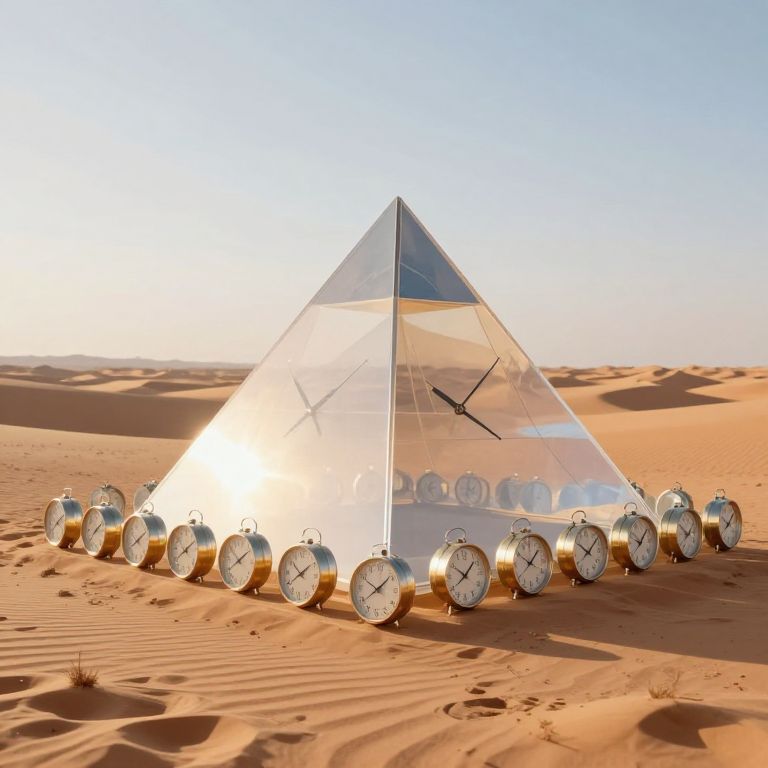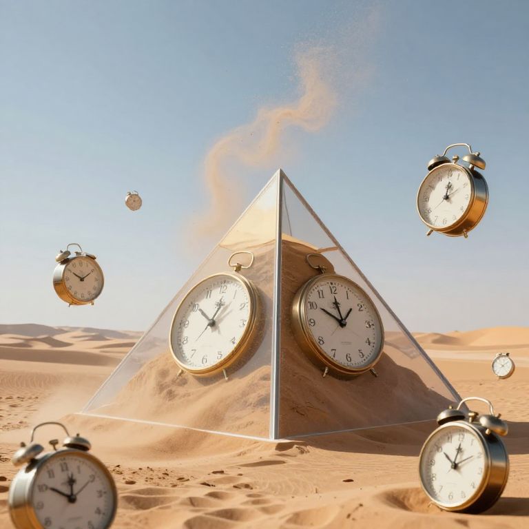 In a surreal desert landscape, a translucent pyramid floats serenely above rows of suspended clocks, their hands frozen in time, as sand drifts upward like whispers of forgotten memories, evoking a profound sense of transience and the eternal dance between past and present.