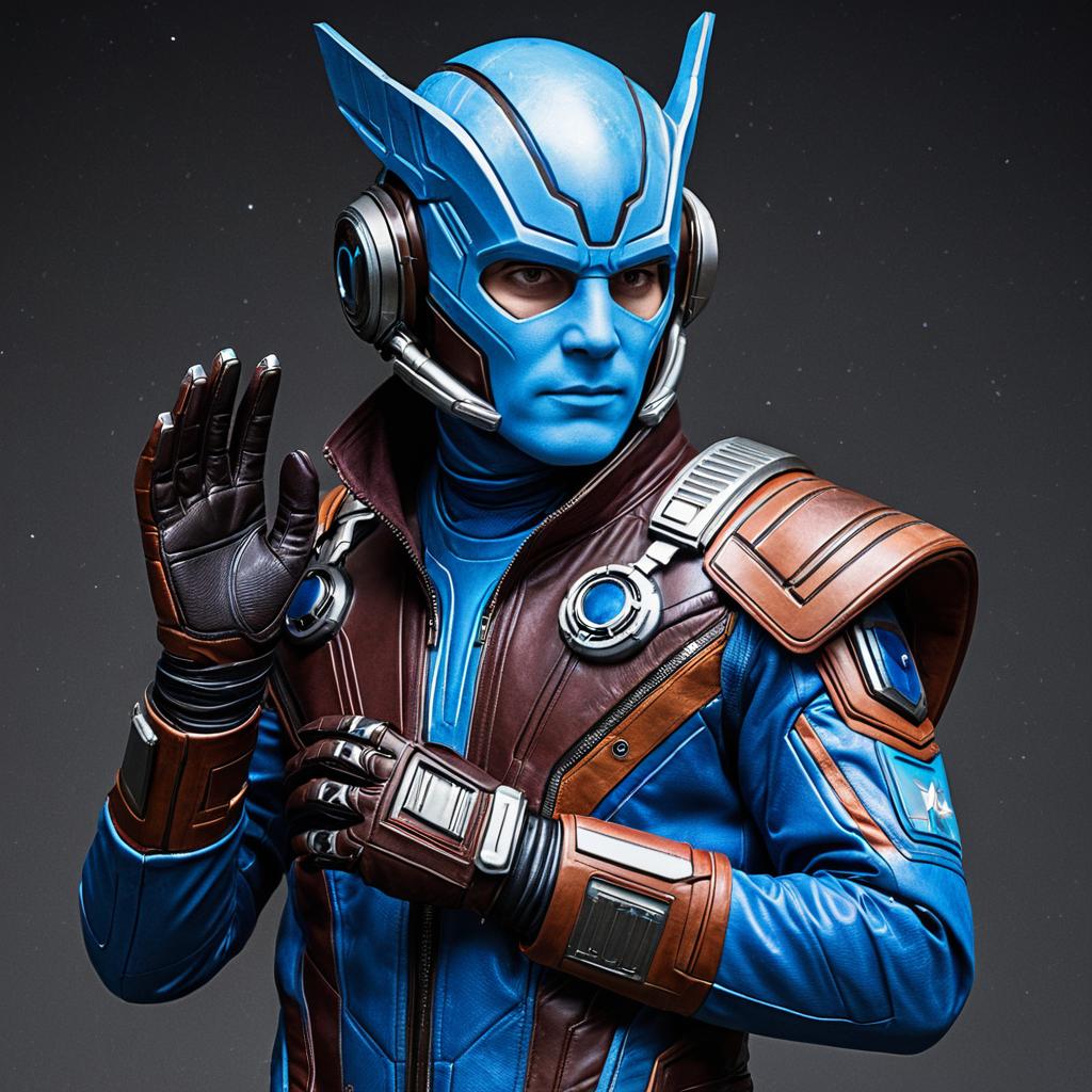 Guardians galaxy outfit,alien, 1boy, blue skin, male focus, science fiction, colored skin, solo, realistic, pointy ears, gloves, brown hair, pilot suit