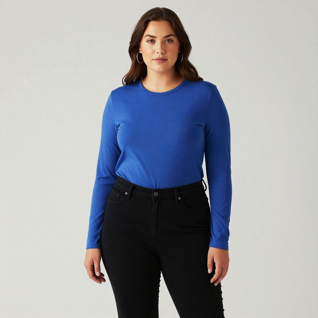 Plus Size Long Sleeve Shirt, a woman in a blue shirt and black pants posing for a picture