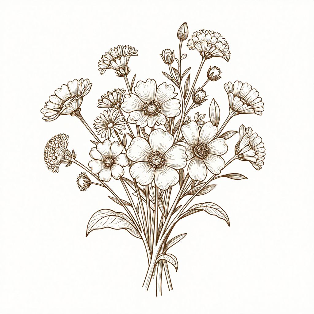Line art from photo, intricate botanical illustration featuring a bouquet of wildflowers, fine thin lines emphasizing delicate petals and leaves, balanced composition, elegant and refined with subtle texture, monochrome ink drawing style