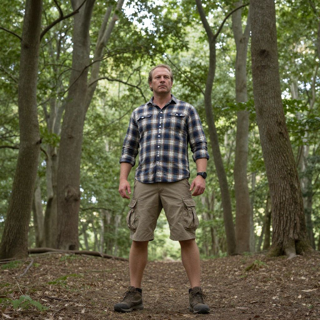 A strong man stands confidently in a serene forest, surrounded by tall trees and soft sunlight filtering through the branches. Clad in a plaid shirt and cargo shorts, he embodies a rugged outdoor spirit, perfectly blending with the tranquil natural environment.