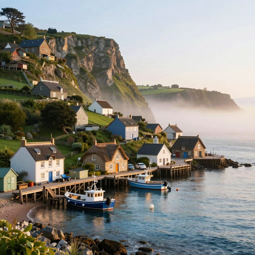 Photograph of a serene coastal village at sunrise. The image features charming white and pastel-colored cottages with dark roofs, nestled on a grassy hillside overlooking a calm blue sea. Several small boats are docked on wooden piers that extend into the water. The background reveals a steep, rocky cliff with sparse greenery, bathed in soft morning light. Mist gently rises from the sea, adding a dreamy atmosphere. The cottages are arranged in a slightly ascending pattern up the hill, with a narrow road winding through the village. The overall scene is picturesque and peaceful.