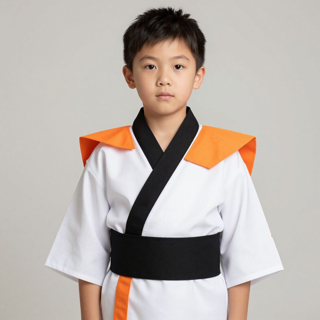 Photograph of an Asian boy with short black hair, standing against a plain white background. He wears a traditional white martial arts uniform with black and orange accents; a black obi belt around his waist, and orange shoulder flaps. His expression is neutral, and he looks directly at the camera. The uniform is clean and crisp, with a smooth texture. The image is well-lit, highlighting the colors and details of his outfit.