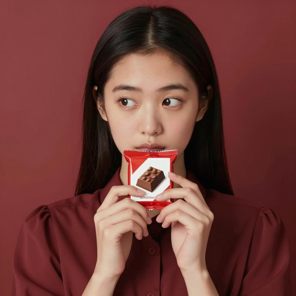 Young Japanese woman with straight black hair, wearing a maroon blouse, holding a red and white chocolate package to her mouth. She is looking slightly to the side with a neutral expression. Red background. Hands holding package are in the center, her face is in the middle. Soft light, slight shadow on right side. Image is a photograph.