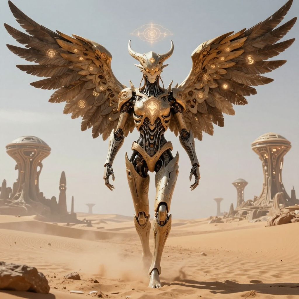 Digital art depicting a futuristic, angelic humanoid figure with large, golden-brown, feathered wings, standing in a desert landscape. The figure has a metallic, ornate body with intricate patterns, a glowing circular emblem on its chest, and a horned helmet with a radiant halo above its head. The background features futuristic, dome-shaped structures and a sandy, sunlit landscape. The figure's stance is powerful, with arms slightly bent and wings spread wide. The art style combines sci-fi and fantasy elements, creating a celestial warrior-like appearance. The sky is clear and blue, contrasting with the golden hues of the figure and the sandy ground.